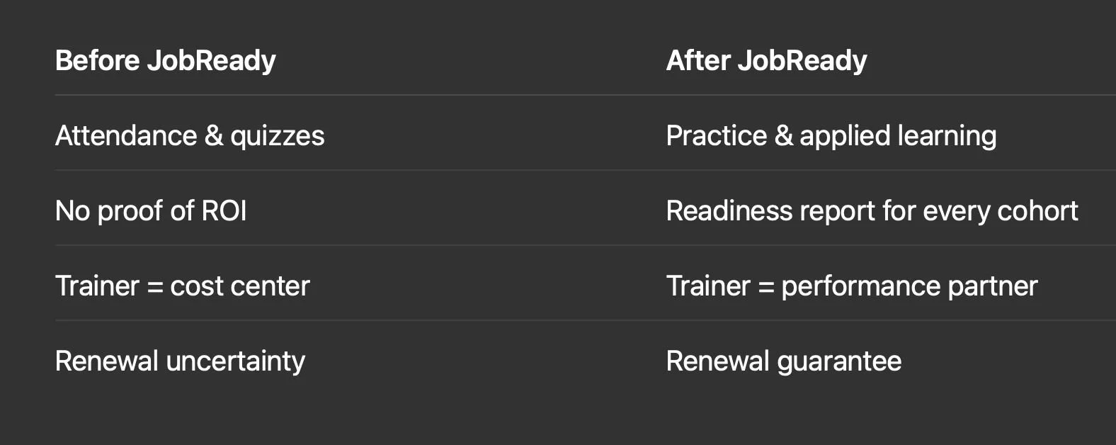 “JobReady turned my training from a one-time event into measurable ROI.”